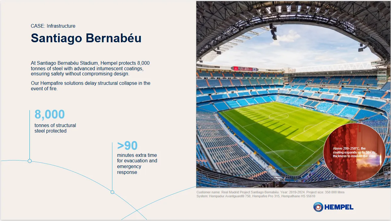 A nagy kapacitású sportlétesítmények tűzvédelme kiemelt fontosságú, hiszen ezekben az épületekben több tízezer ember tartózkodik egy időben. A madridi és barcelonai stadionok ezért a legmodernebb technológiát alkalmazták tűzgátló védelmük érdekében: a Hempafire Pro Fast Dry tűzgátló bevonatot.